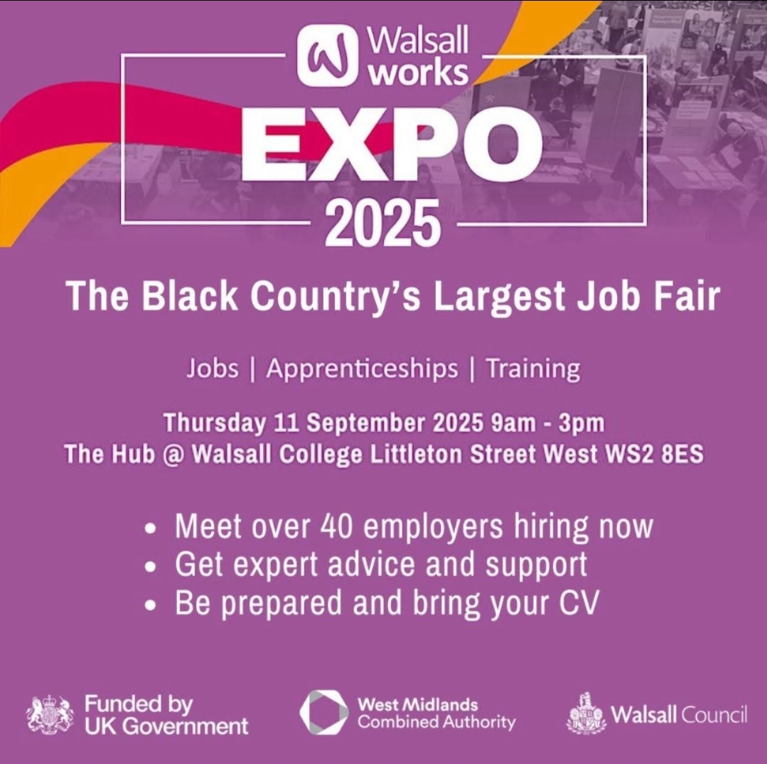 @WalsallWorks is hosting a jobs EXPO this September at @Walsall_College! Thursday 11 September 2025 9am – 3pm The Hub, Walsall College, Littleton Street West, WS2