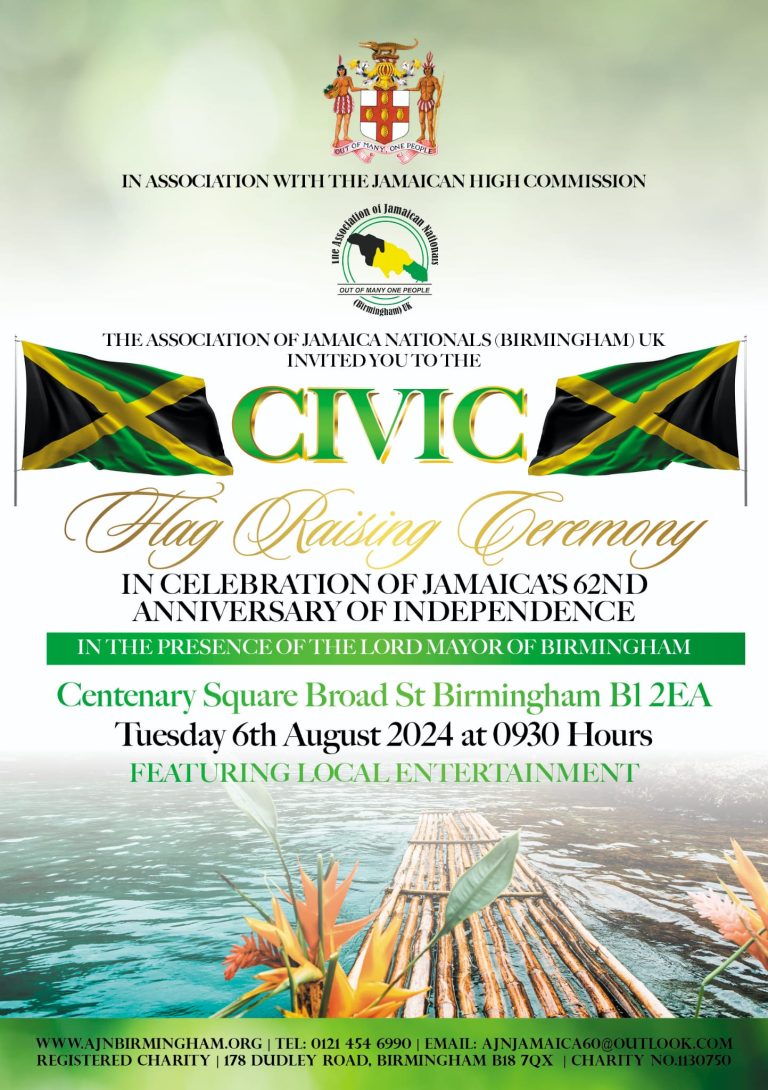 The Association of Jamaica nationals(Birmingham)UK invite you to the Civic Flag Raising Ceremony, In celebration of Jamaica’s 62nd anniversary of independence.